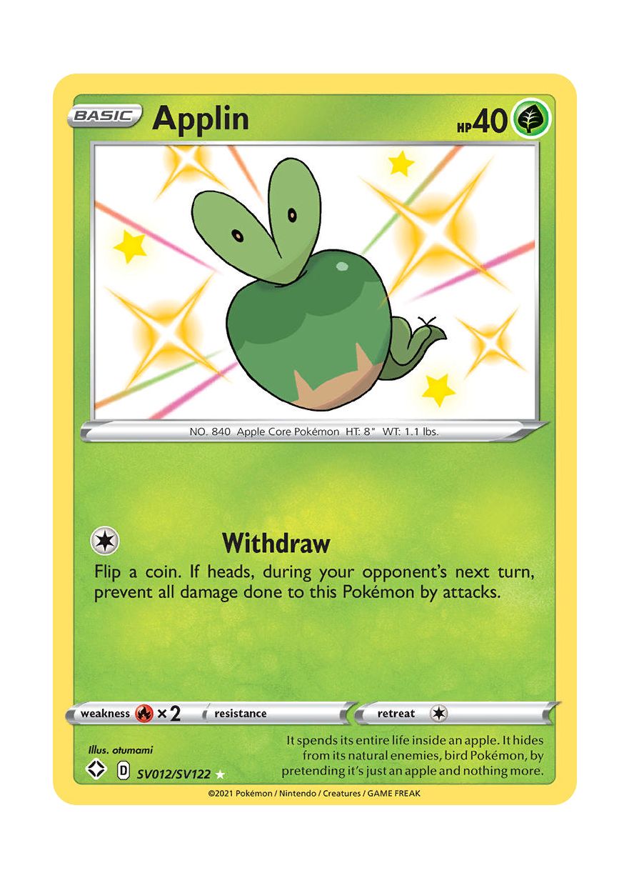 Ontdek de glans en zeldzaamheid van de "Applin" Pokémonkaart, een must-have voor elke verzamelaar die uitblinkt met zijn schitterende Rare Shiny uitvoering. Met een levendige kleurencombinatie en uniek holografisch ontwerp, vangt deze kaart de essentie van dit charmante wezen perfect, terwijl het een aanlokkelijke glinstering toevoegt aan jouw Pokémon-collectie. "Applin" verrijkt jouw spel met een vleugje glans, waardoor het niet alleen een bewonderenswaardig verzamelobject is, maar ook een kaart die de aandacht trekt tijdens je volgende Pokémon-kaartduel.