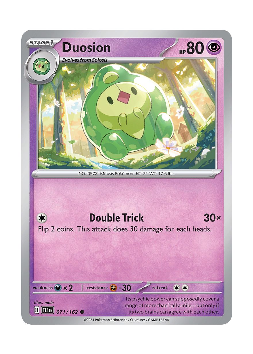 De "Duosion" Pokémonkaart is een Common zeldzaamheid kaart die de psy-kachtige cellen van deze opmerkelijke Pokémon weergeeft, welke bekend staat om zijn intellectuele capaciteiten. Het artwork op de kaart toont Duosion in een kenmerkende pose, omringd door een energieke gloed die zijn psychische bekwaamheden benadrukt. Deze kaart is een essentiële aanwinst voor verzamelaars die de uitbreiding van hun collectie richten op het samenvoegen van zowel krachtige als alledaagse Pokémon.