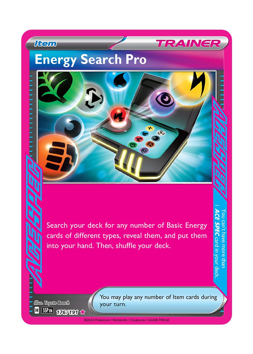 De Pokémonkaart "Energy Search Pro" is een zeldzame ACE SPEC-kaart die elke trainer helpt om met ongeëvenaarde efficiëntie energiekaarten uit hun deck te halen. Deze kaart maakt het mogelijk om razendsnel de benodigde energie voor hand strategieën te vergaren, waardoor je altijd een stap vooruit blijft in de strijd. Door het unieke ACE SPEC-kenmerk kan slechts één van deze krachtige kaarten in een deck zitten, wat het een onmisbaar strategisch hulpmiddel maakt voor elke serieuze Pokémontrainer.