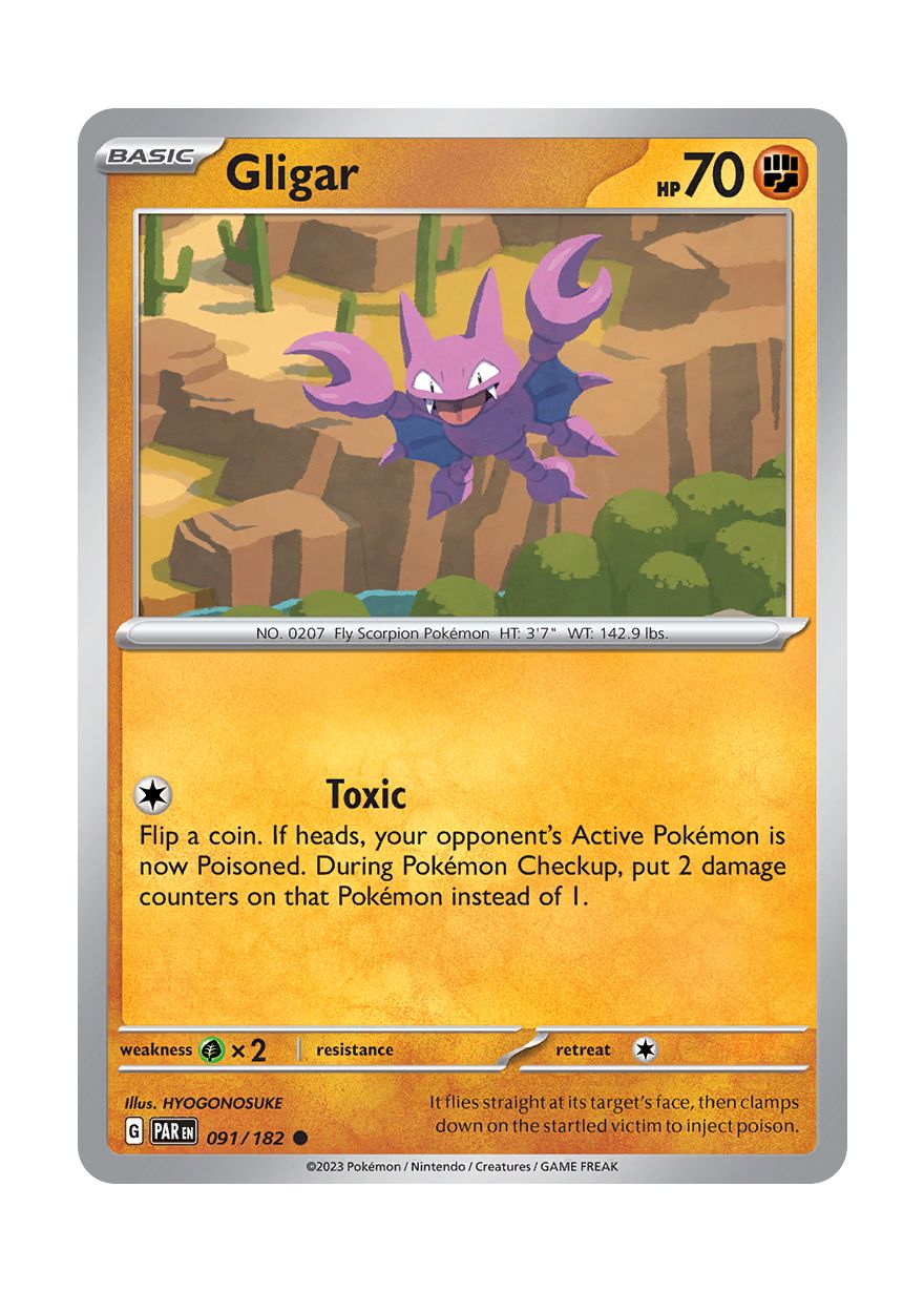 De Gligar-pokemonkaart, gekenmerkt door zijn Common zeldzaamheid, toont de sluwe vleermuis-schorpioen Pokémon, klaar om met strategisch inzicht tegenstanders te verrassen. Met zijn aardse kleurenpalet en scherpe blik, weerspiegelt de illustratie perfect de behendige en avontuurlijke geest van dit wezen. Verzamelaars en spelers waarderen de betrouwbaarheid die de Gligar-kaart aan hun deck toevoegt, en zijn altijd opgetogen om deze veelzijdige kaart in hun verzameling te vinden.