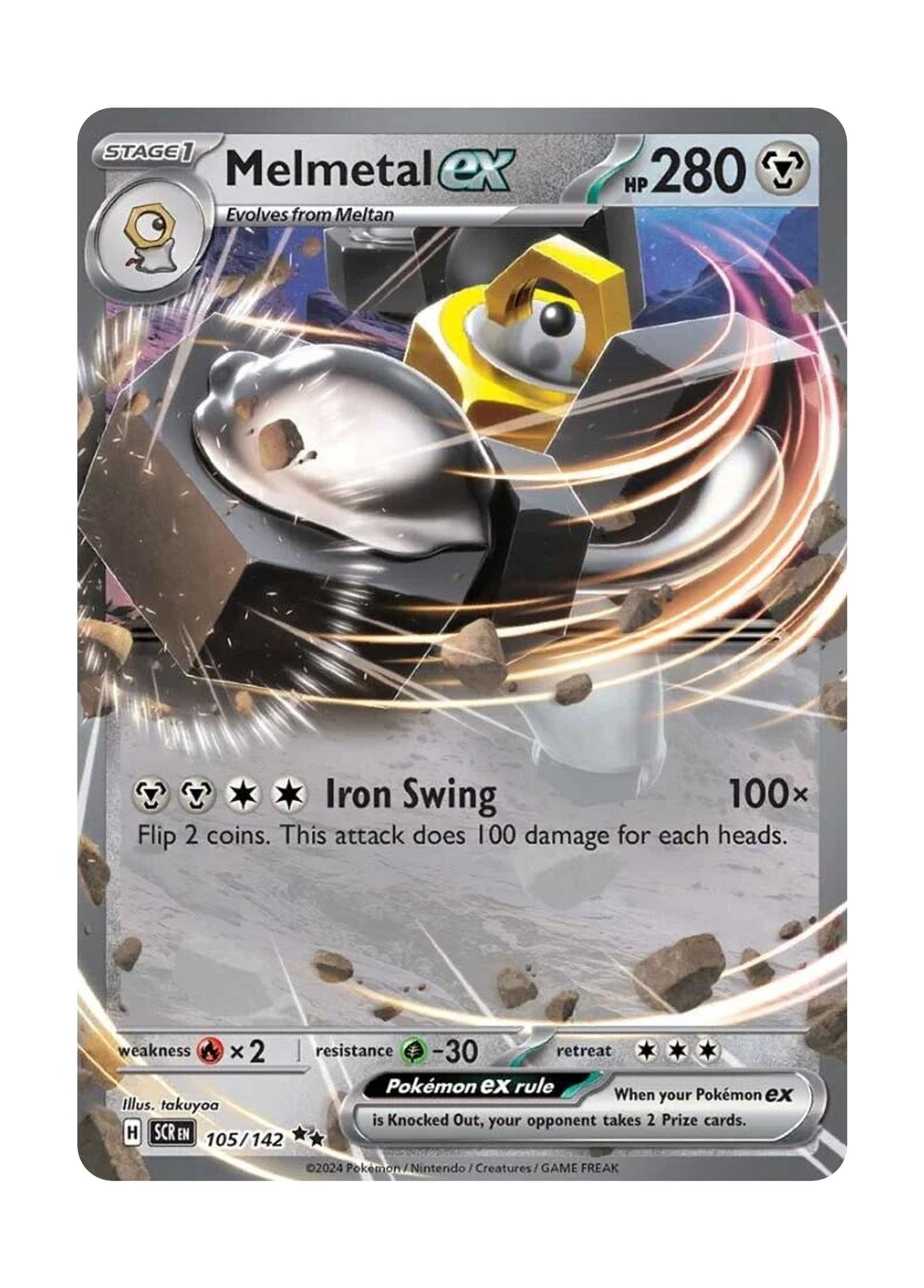 Melmetal ex is een Double Rare Pokémonkaart die uitblinkt met spectaculaire kunstwerken en indrukwekkende details, waardoor elke verzameling er direct mee opwaardeert. Deze kaart combineert zowel kracht als zeldzaamheid, wat zorgt voor bewondering onder verzamelaars en TCG-spelers. Met zijn glinsterende folie en robuuste uitstraling maakt Melmetal ex elke deck of display onvergetelijk.
