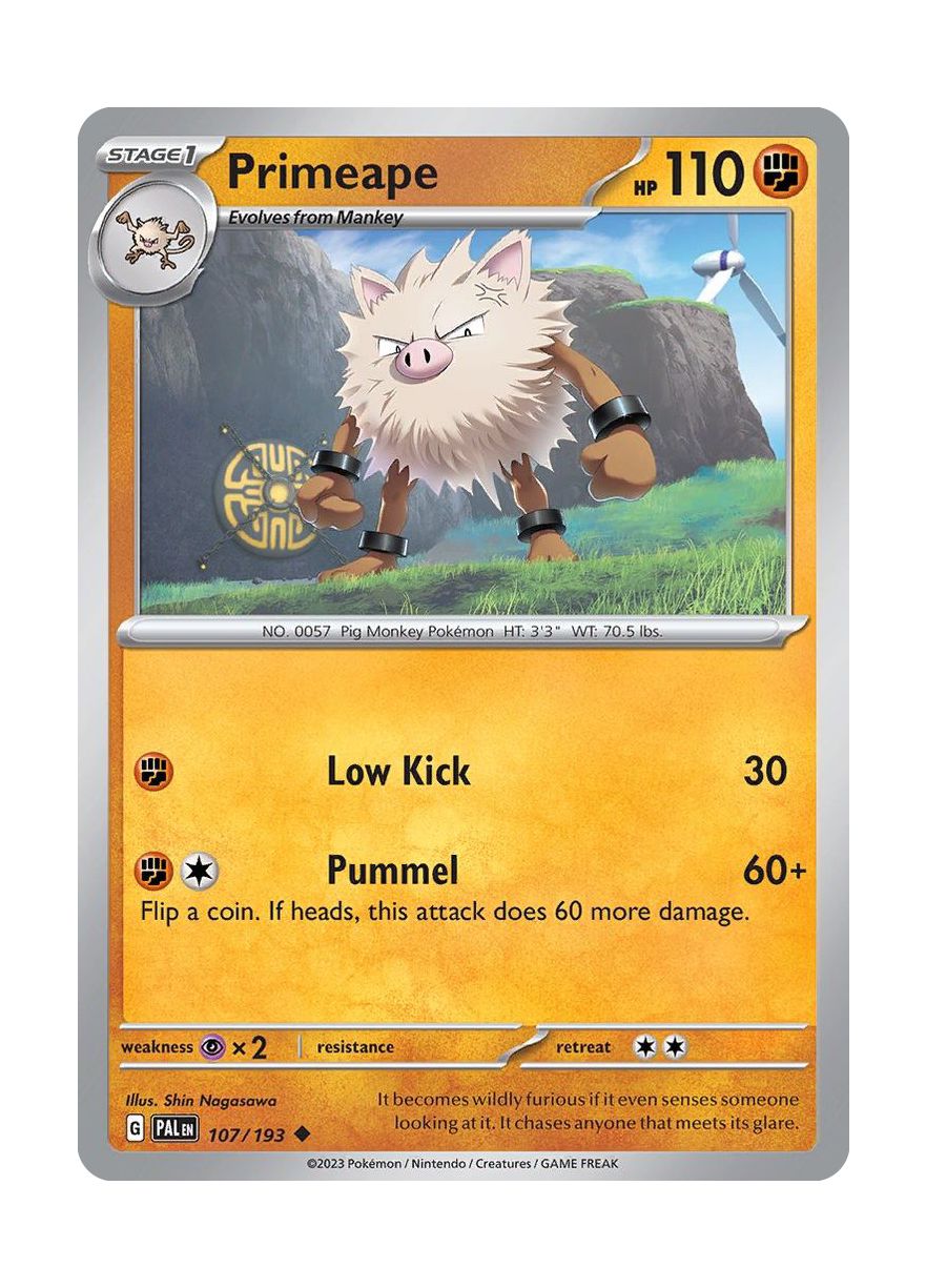 Duik in de wereld van Pokémon met de "Primeape" Uncommon kaart, een must-have voor elke verzamelaar die geïnteresseerd is in het versterken van hun deck met de ongetemde kracht van deze vechtlustige Pokémon. Dit exemplaar biedt een unieke kans om de dynamiek en strategie van je spel te verrijken, gezien zijn potentieel om tegenstanders te intimideren op het slagveld. De kaart onderscheidt zich door zijn zeldzaamheid als Uncommon, wat betekent dat hij een waardevolle aanwinst kan zijn zonder extreem zeldzaam te zijn, waardoor hij toegankelijk is voor zowel beginnende verzamelaars als doorgewinterde spelers.