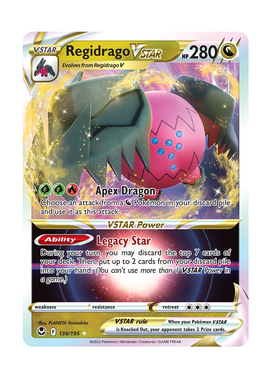 De Regidrago VSTAR kaart behoort tot de majestueuze categorie van Rare Holo VSTAR kaarten, een must-have voor verzamelaars en spelers die op zoek zijn naar die extra glans en zeldzaamheid in hun deck. Met zijn indrukwekkende holografische illustratie komt de imponerende kracht van Regidrago tot leven, terwijl de VSTAR status aangeeft dat deze kaart potentieel spel-veranderende mogelijkheden heeft op het slagveld. Het exclusieve ontwerp wordt gecompleteerd door de kenmerkende sterrenprint die aangeeft dat Regidrago VSTAR niet alleen visueel verbluffend is, maar ook een formidabele tegenstander in de Pokémon Trading Card Game.