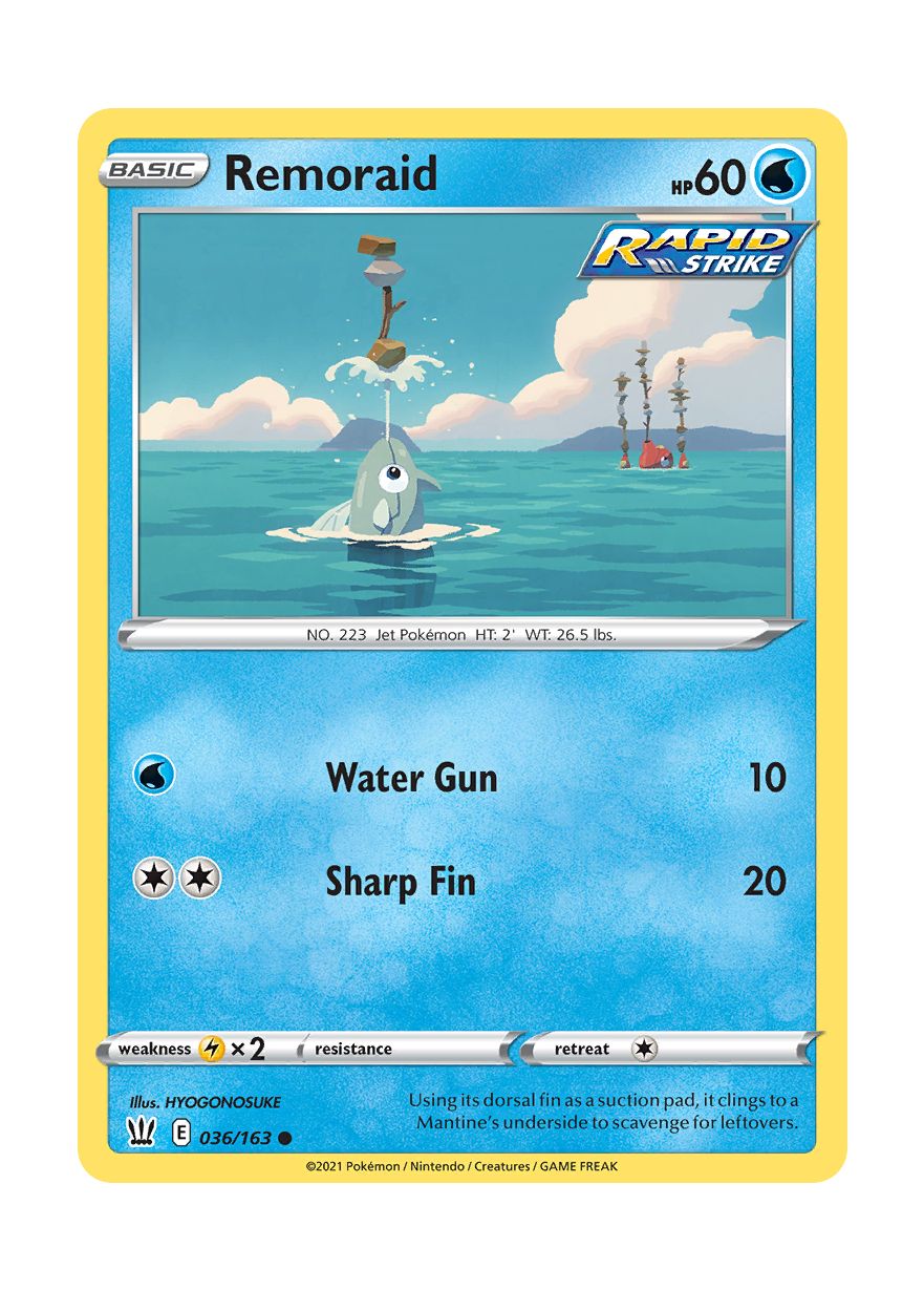 De Remoraid-kaart is een basis-Pokémonkaart met de zeldzaamheid 'Common', en is geliefd bij verzamelaars en spelers van het Pokémon Trading Card Game vanwege het gemak waarmee het te vinden en toe te voegen is aan ieders collectie. Deze kaart toont de water type Pokémon Remoraid, bekend om zijn gelijkenis met een kogelvis, en wordt vaak ingezet voor zijn strategische waarde ondanks zijn eenvoud. Met zijn aantrekkelijke illustratie en toegankelijkheid is deze kaart ideaal voor beginnende spelers die hun decks willen uitbreiden en beter bekend willen raken met de dynamiek van het spel.